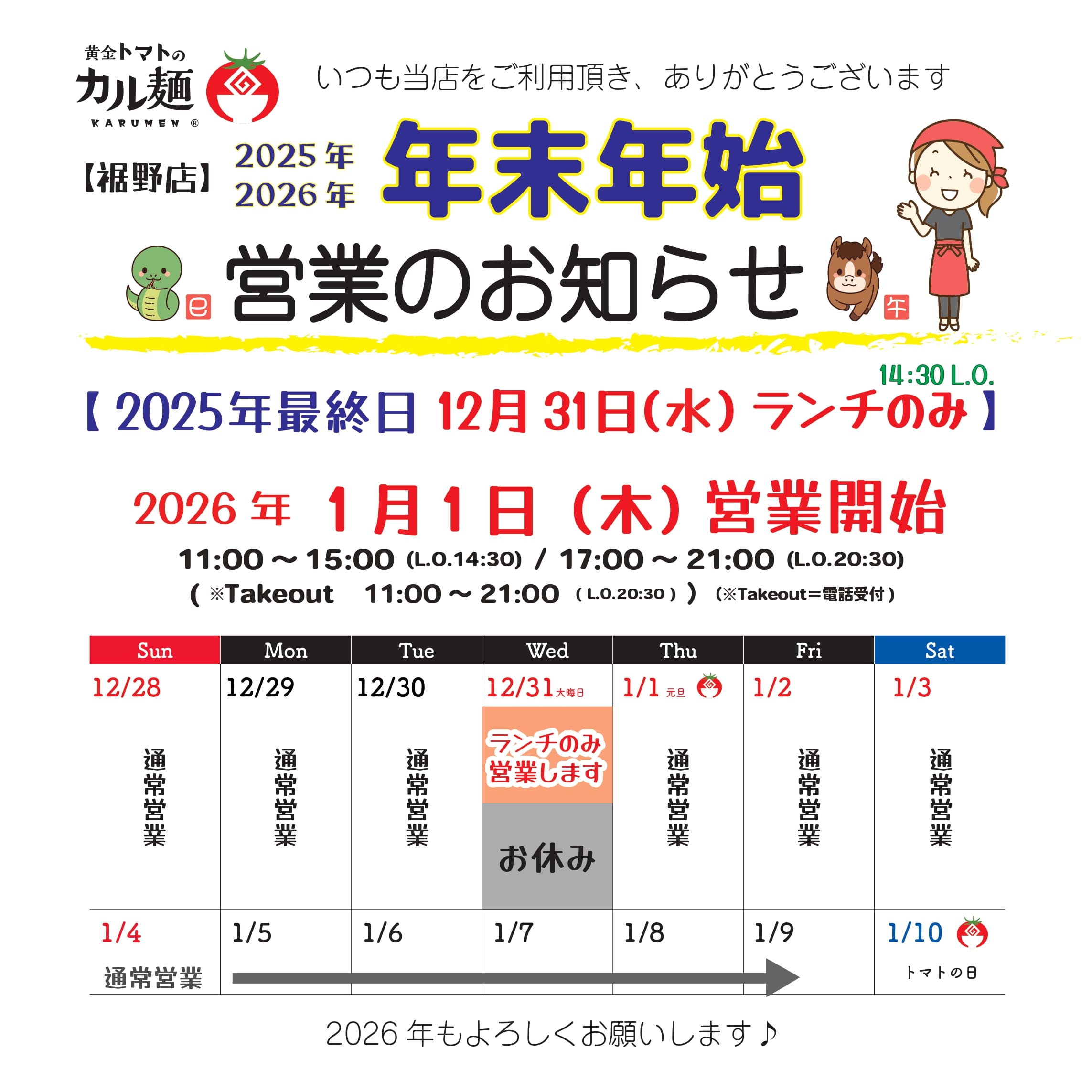2025年も残りわずかとなりましたが、美味しいカル麺をご用意してお待ちしております。 2026年も変わらぬご愛顧をよろしくお願いいたします。